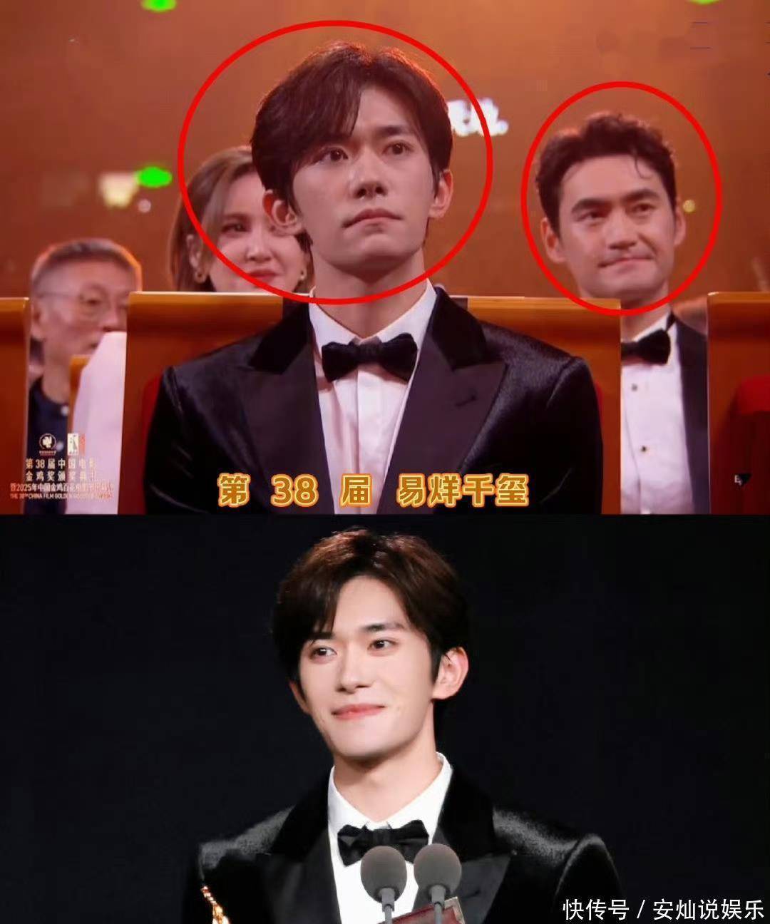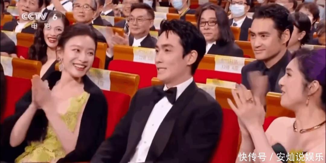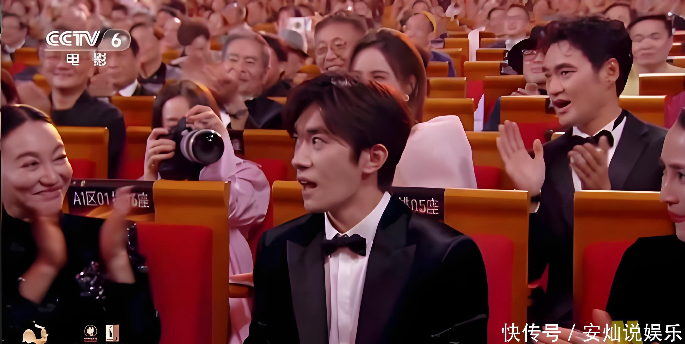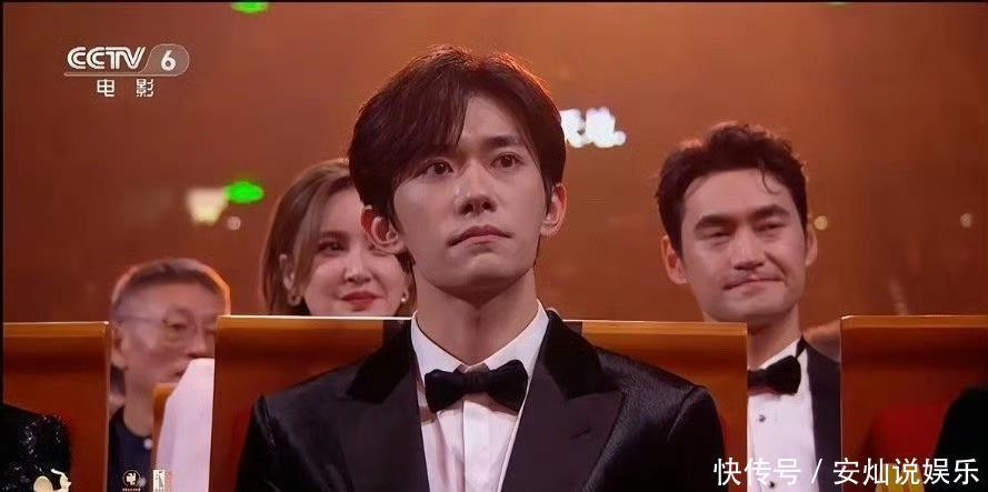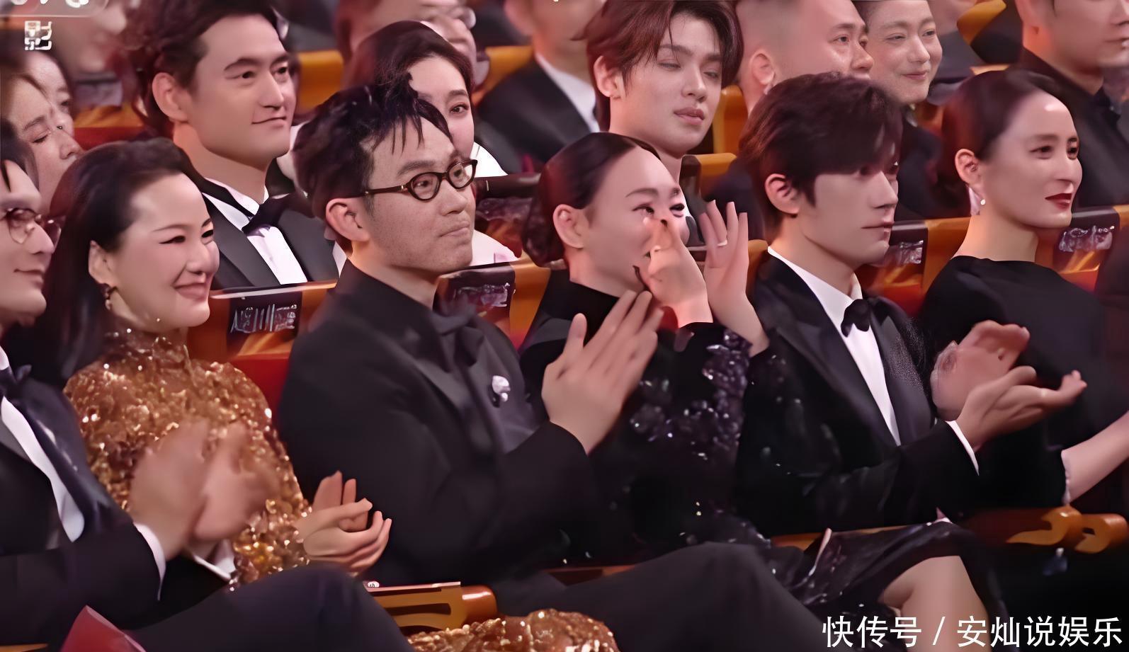 通过大屏幕,我们看到蒋勤勤坐袁弘正前方,易烊千玺坐张歆艺(袁弘妻子)前方,结果易烊千玺获奖了。